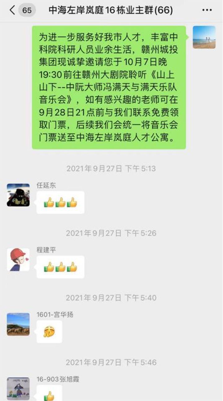 9月17日,支部書記帶隊再次到人才公寓走訪,了解到科研人員平時忙碌、業(yè)余文化生活不豐富,大部分科研人員中秋國慶期間因離家較遠(yuǎn)和疫情防控將留贛。為滿足人才精神文化需求,民晟實業(yè)公司聯(lián)合贛州市保利劇院管理有限公司,在“文化惠民”政策下,邀請留贛科研人員在贛州大劇院免費聆聽“山上山下”中阮演奏音樂會,黨員先鋒隊成員還專程送公益票上門。消息一經(jīng)人才公寓業(yè)主群發(fā)出,反響熱烈,獲得科研人員頻頻“點贊”?!案兄x你們的關(guān)心關(guān)懷和貼心服務(wù),讓我們國慶留贛能聽一場名家現(xiàn)場音樂會!”領(lǐng)票現(xiàn)場,一位科研人員說道。